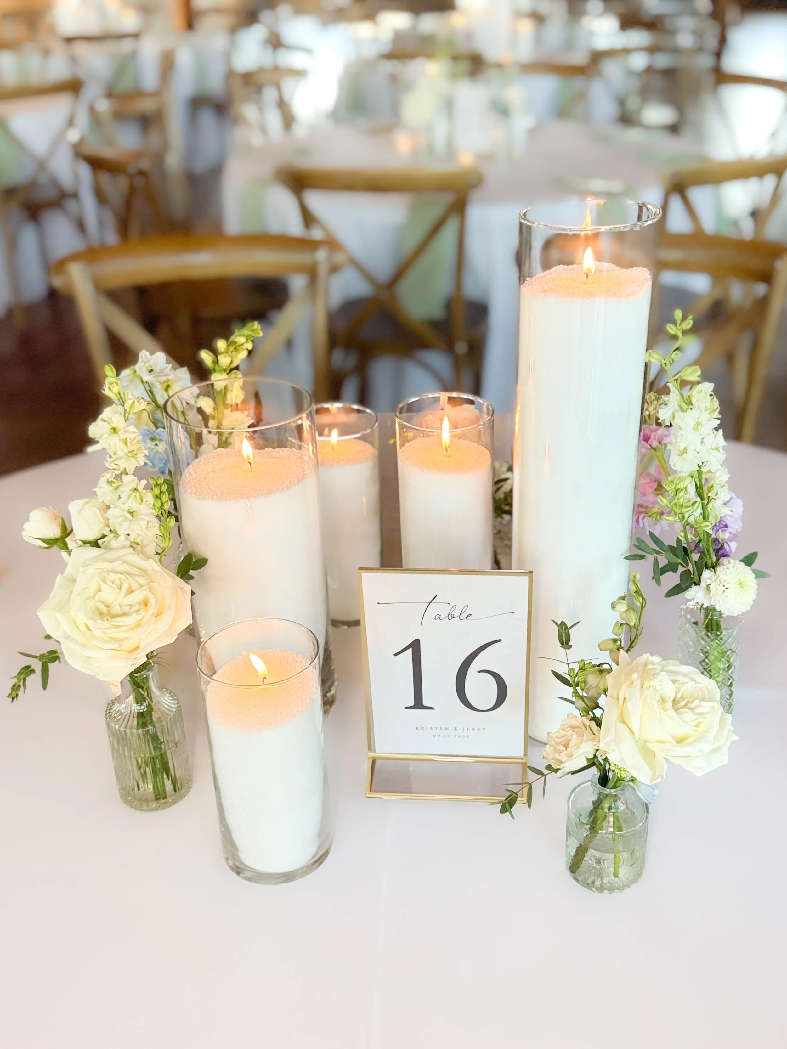5 taper candles with 3 medium arrangement groupings